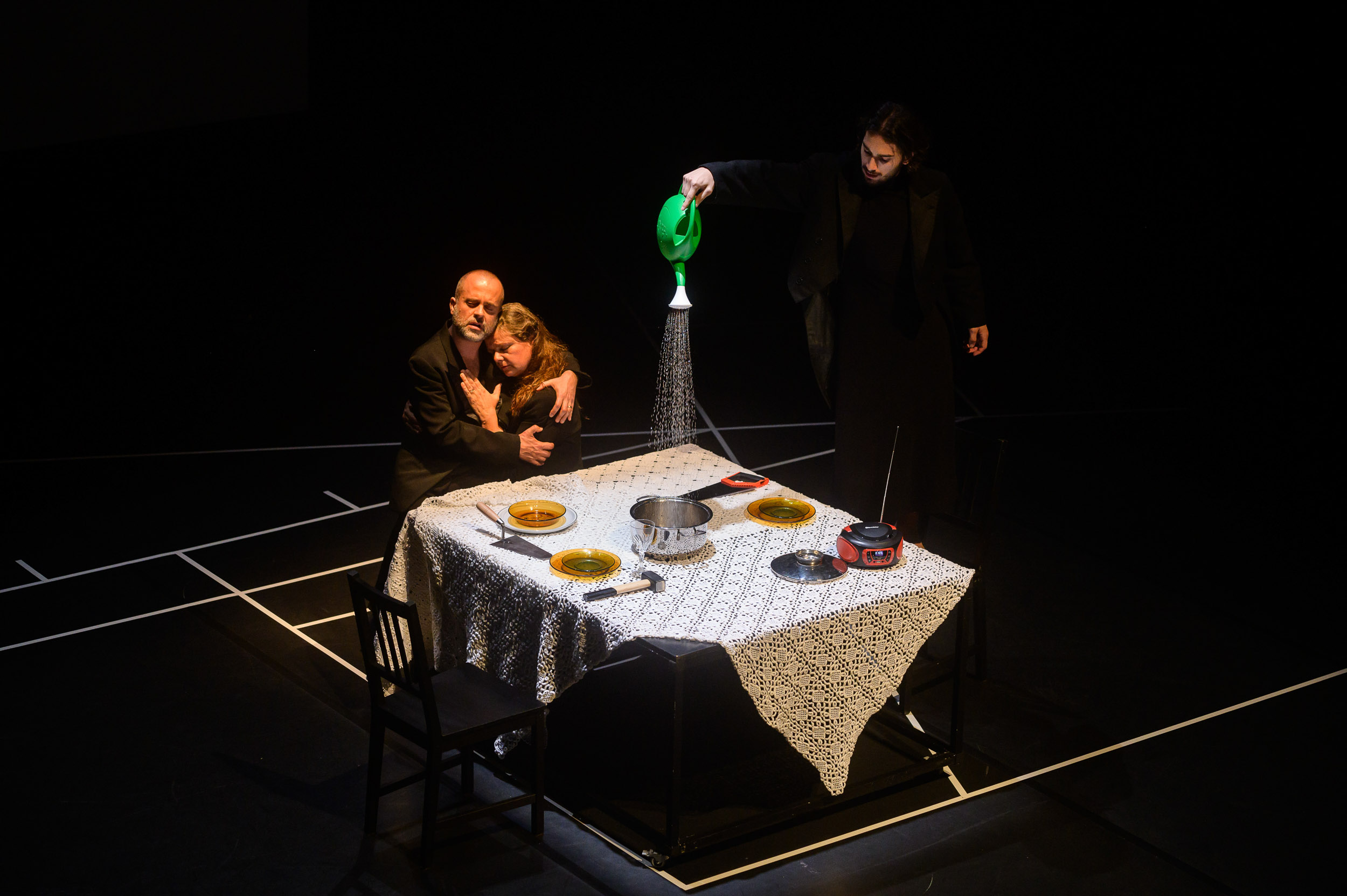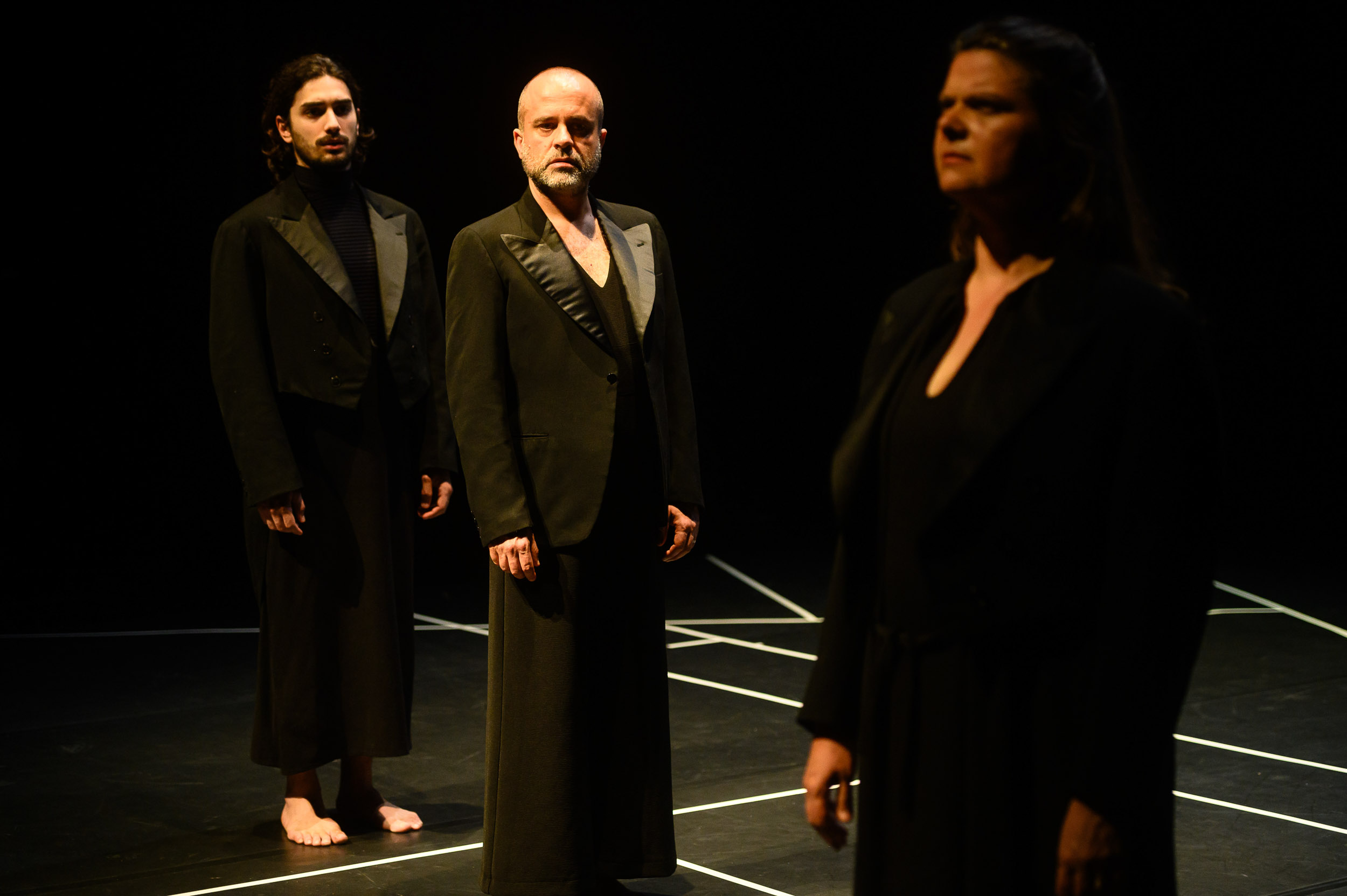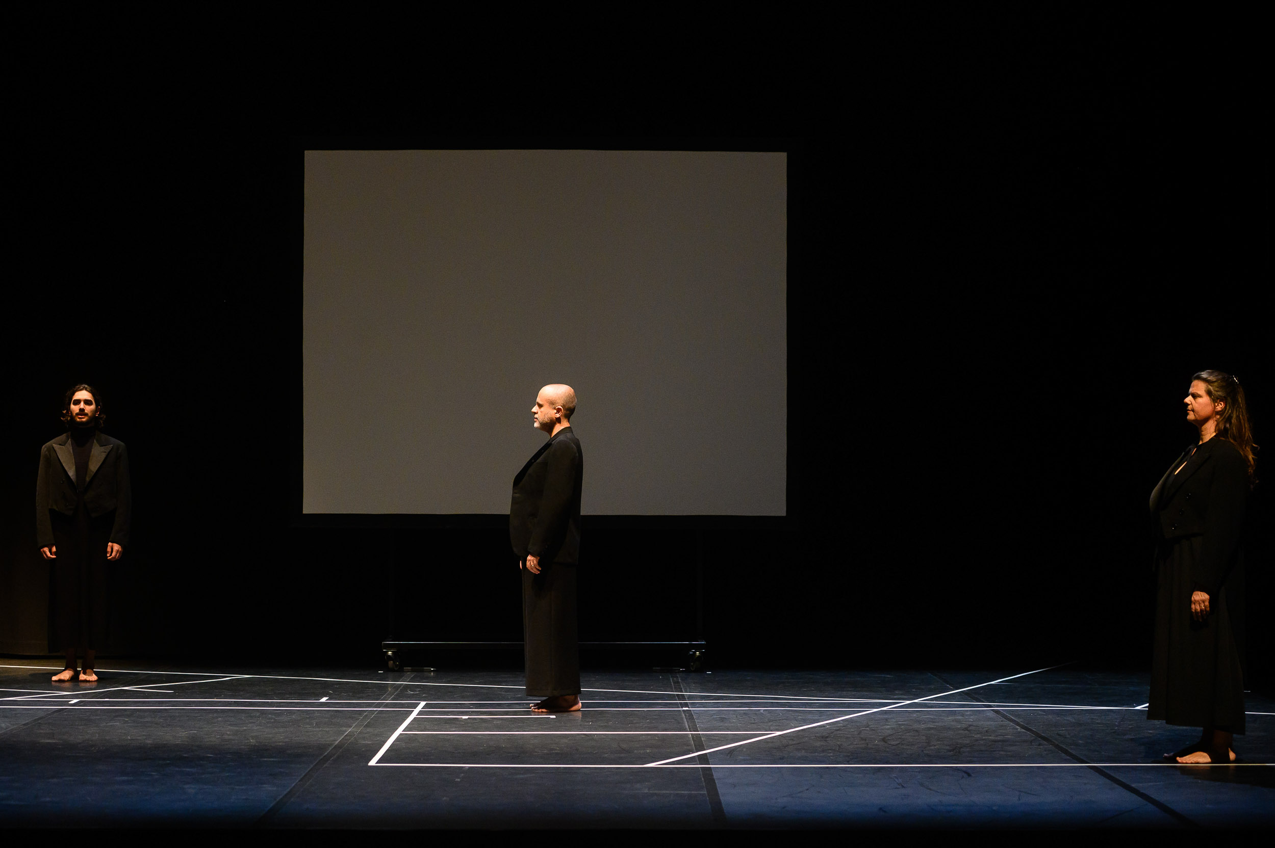 O dispositivo dramatúrgico desenvolve-se de forma coral. O coro é composto por Rafaela, Fernando e Daniel. As vozes repetem, ajustam, enumeram. Os papéis deslizam sem nunca se fixarem. Não são personagens no sentido clássico, funcionam como posições dramatúrgicas dentro de um sistema.