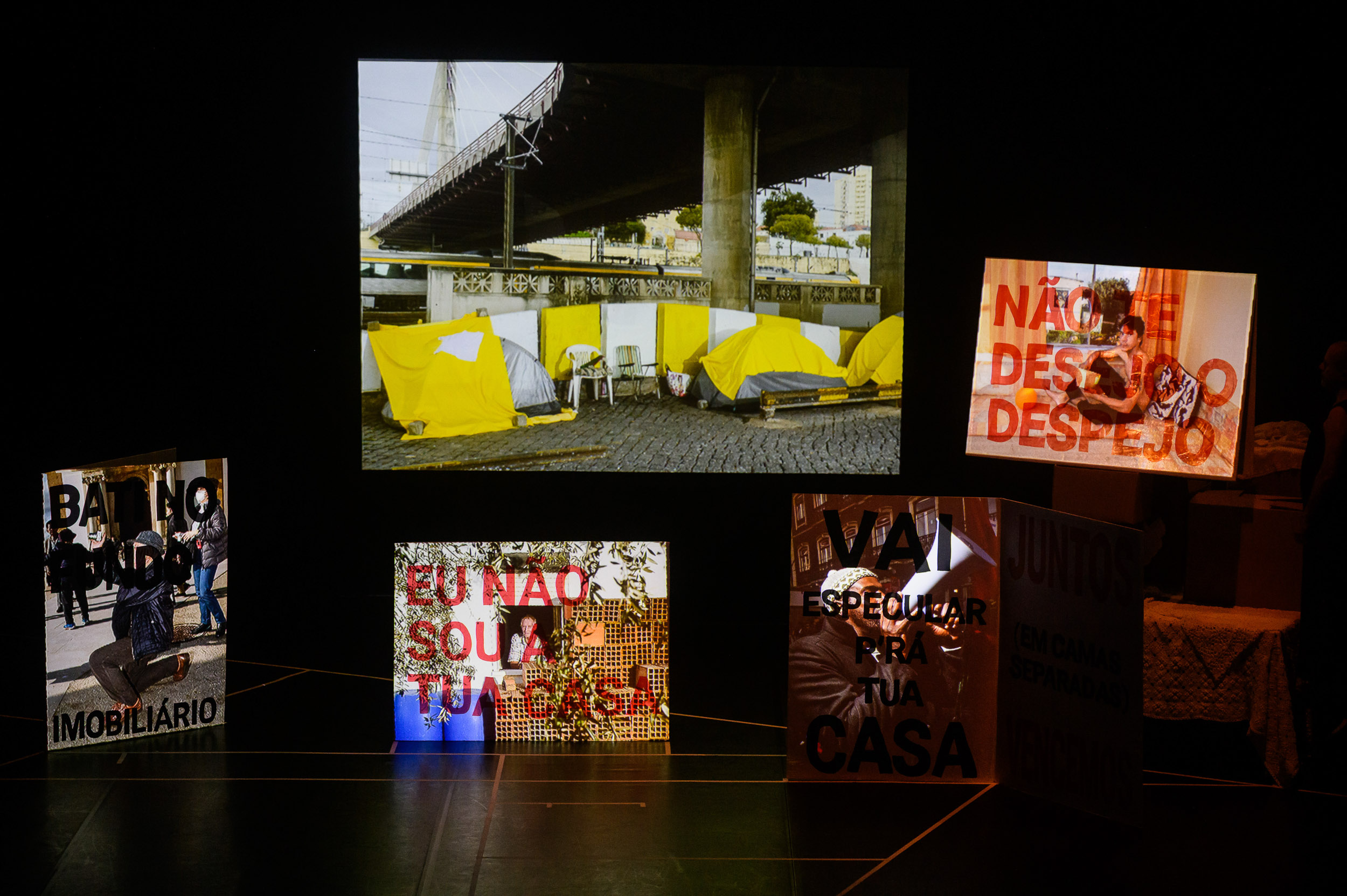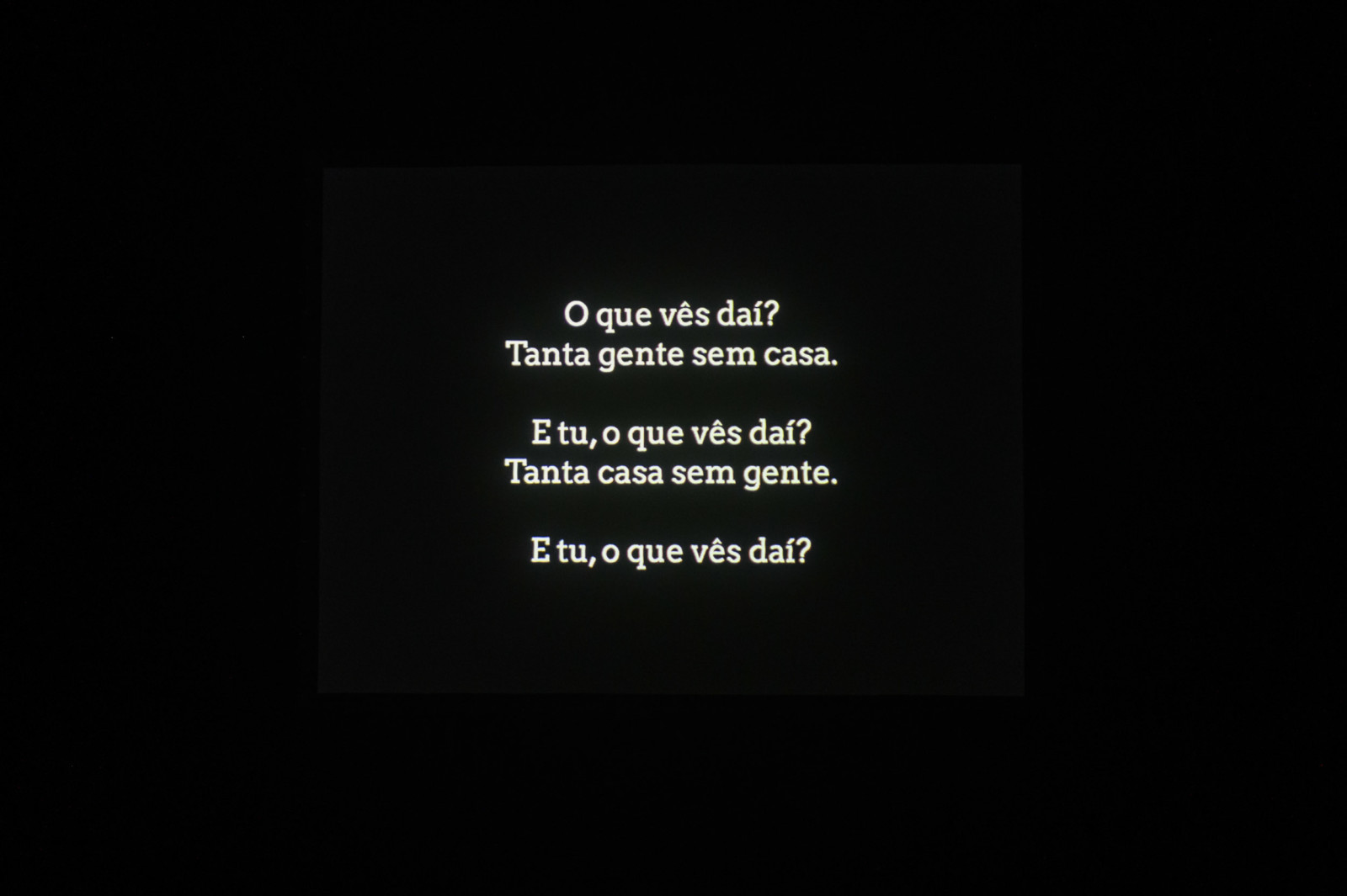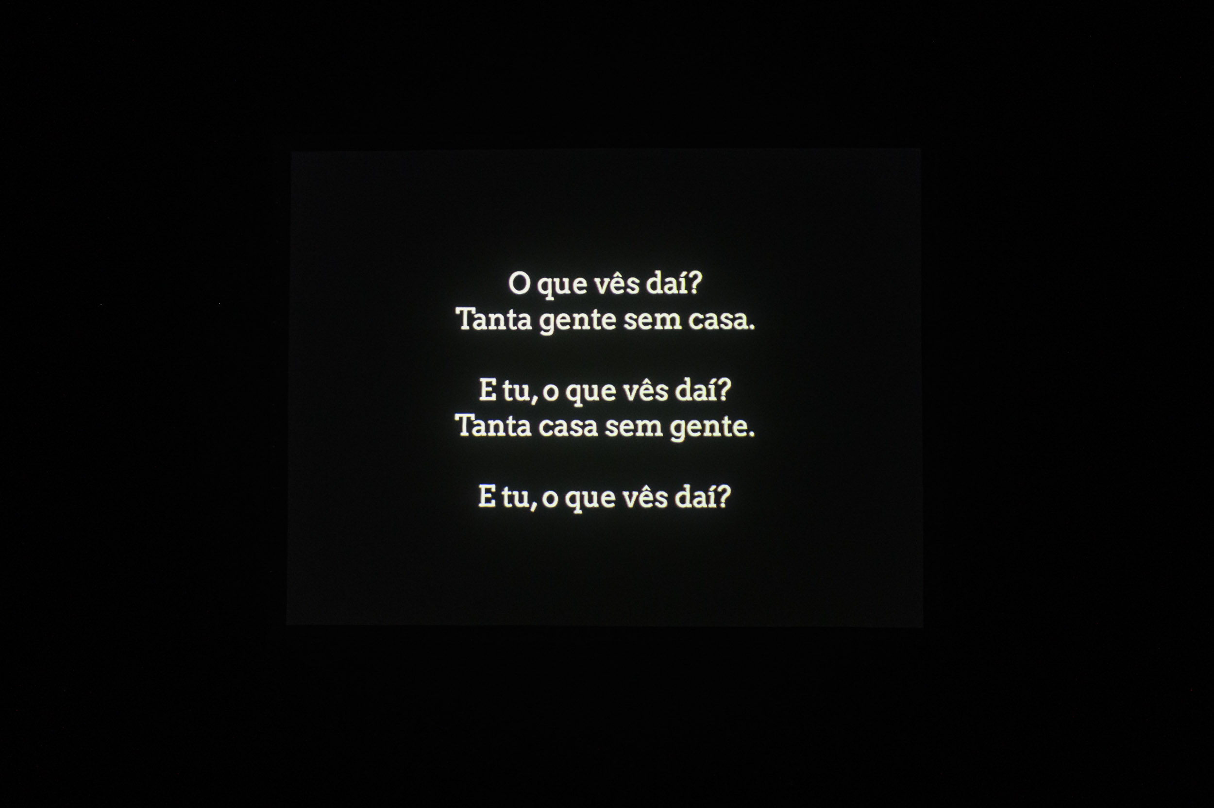 Após este excesso verbal, a peça muda de regime, suspende a palavra e devolve o problema à fotografia e ao espaço através de projecção (…) Mais tarde, a linguagem regressa sob outra forma: frases-manifesto, palavras de ordem deslocadas para o interior do teatro (…) superfície de inscrição do descontentamento colectivo.
