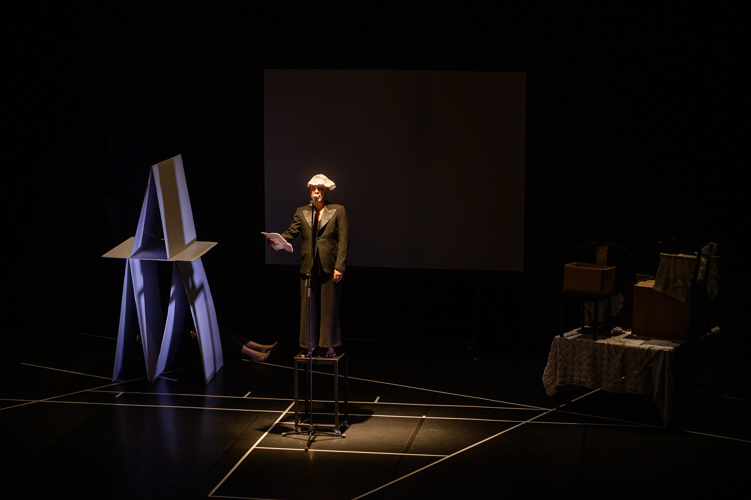 A cenografia, concebida por Henrique Calheta, organiza um espaço instável, próximo de uma black box, onde nada é fixo e tudo pode ser reconfigurado. No fundo do palco, uma tela de projecção permanece visível durante todo o espectáculo, funcionando como horizonte permanente e superfície activa de inscrição.